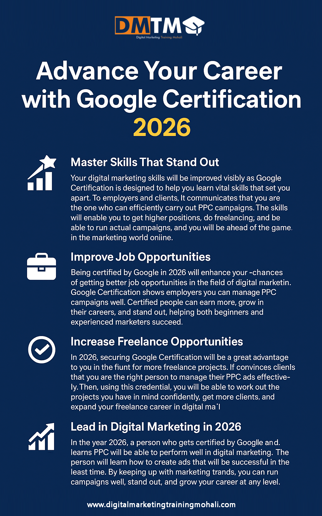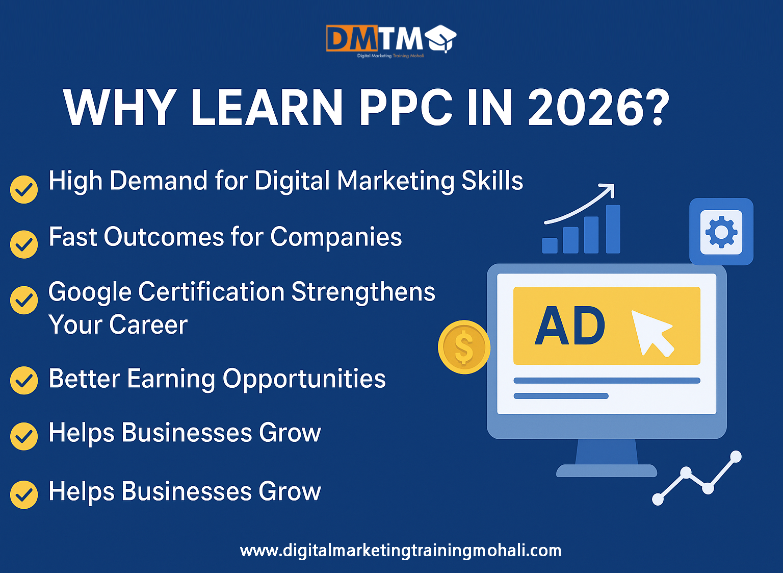 The​‍​‌‍​‍‌​‍​‌‍​‍‌ Advanced PPC Course Mohali at DMTM is a perfect skill-up path for both new learners and experts. Apart from learning theory, you will be involved in practical skills, hands-on projects, and preparation for Google Certification. Such a course is instrumental in upgrading your career via better job opportunities, freelance work, and digital marketing career growth.