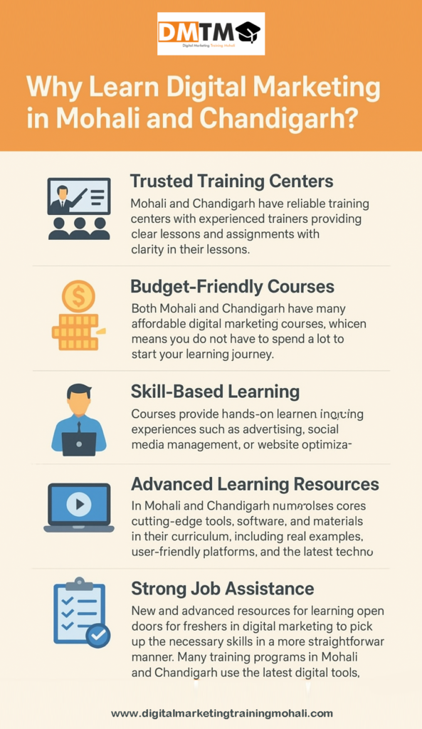 The best way to learn digital marketing is in Mohali and Chandigarh, which is a great choice for beginners. Digital marketing training in Mohali, such as DMTM, has a perfect blend of easy and practical training with real projects and career help. A good career, along with various opportunities, can be opened with the acquisition of the right skills.