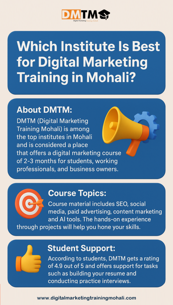 If you are willing to take your career to another level, consider enrolling at DMTM, a reputed digital marketing training institute in Mohali. The online course you take will be skill-oriented, and certificates and placement assistance will be at your disposal. Beginners will find DMTM helpful because it offers guidance, hands-on practice, and support to start and grow a digital marketing career confidently.