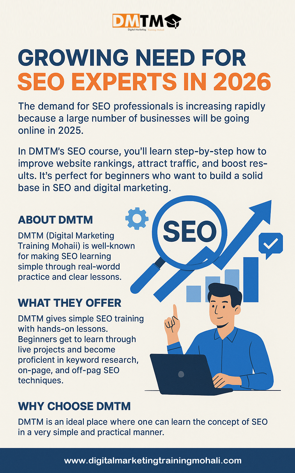 DMTM (Digital Marketing Training Mohali) gives simple SEO training with hands-on lessons. Beginners get to learn through live projects and become proficient in keyword research, on-page, and off-page SEO techniques. This empowers the students to establish a solid foundation for making their way into the digital marketing field and creating a prosperous career.