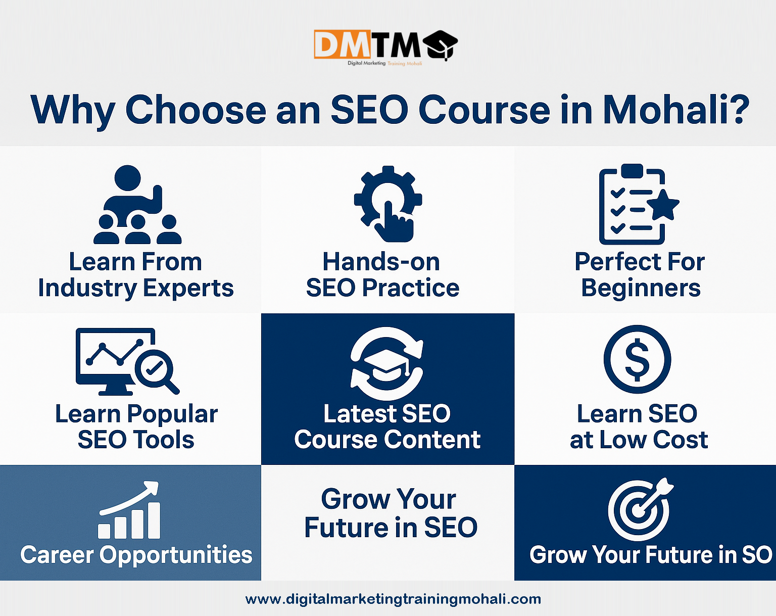 DMTM(Digital Marketing Training Mohali) is well-known for making SEO learning simple through real-world practice and clear lessons. It makes it easy for newcomers and students to grasp the concept of search engine optimization by working on live projects and following detailed lessons. By having experienced trainers and interactive sessions, DMTM provides you with SEO capabilities through which you can build a career in digital marketing and be successful.